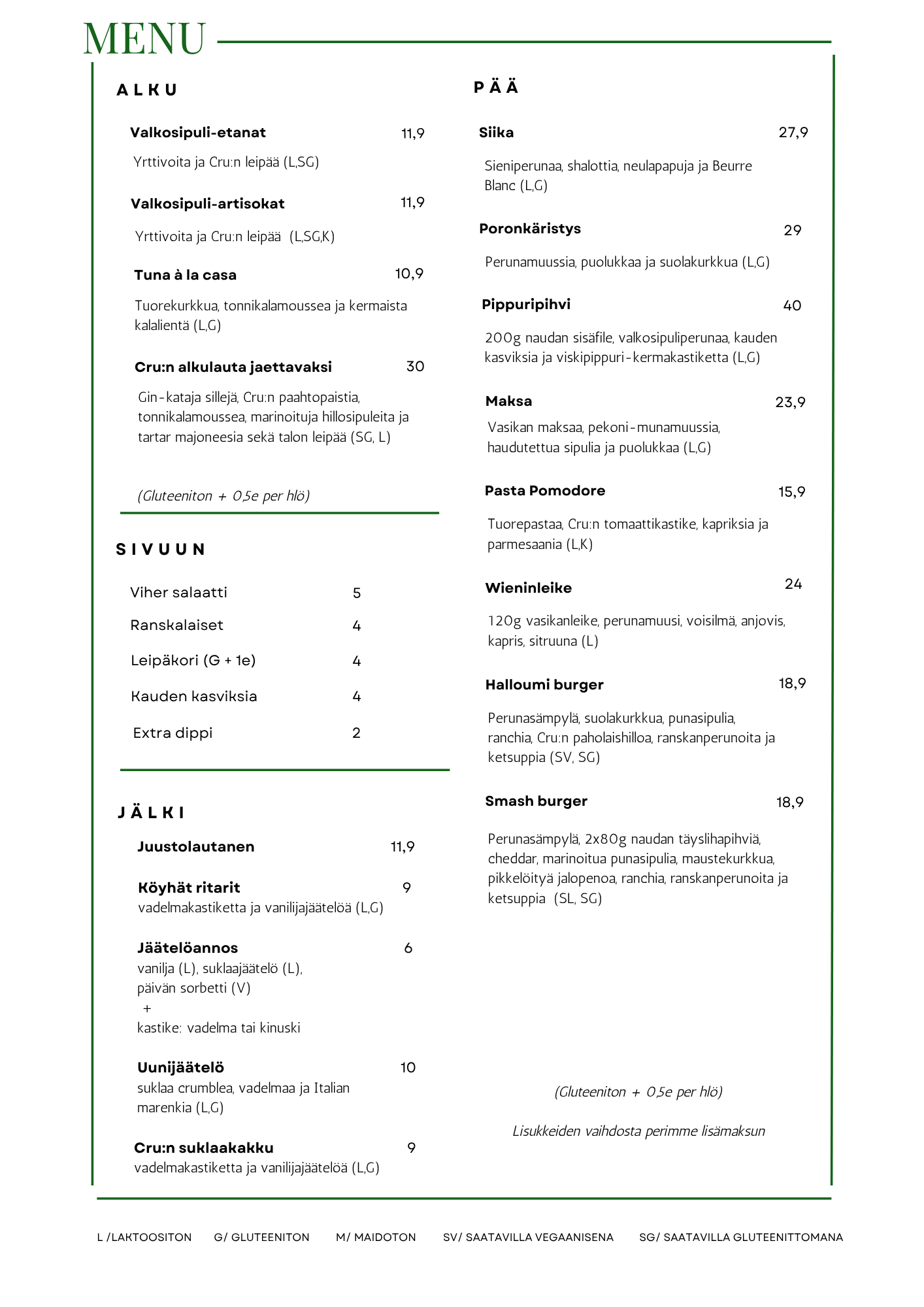 Seuraa meitä somessa @ravintolacru ja käytä #ravintolacru tagia. Merkkaa meidät ja jaa meille upea nautintohetkesi vierailusta!